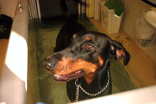 Idag var vi på återbesök och Axa fick promenera i vatten-trasken, vilket hon är måttligt road av. Hon skötte sig dock hyfsat väl men i efterhand förstod jag att det bara var för att invagga mig i säkerhet.... När jag slappnade av och inte höll stadig koll på henne passade hon givetvis på att göra ett jätteskutt med frambenen så att vattnet stänkte rejält åt alla håll och givetvis även rätt över mig.... Efter det släppte jag henne inte med blicken något mer och resten av promenaden gick lugnt tillväga!Efteråt böjde och stretchade Kjerstin igenom Axas vänstra bakben, vilket Axa inte direkt uppskattade.... Men vi får väl se om det har någon verkan....