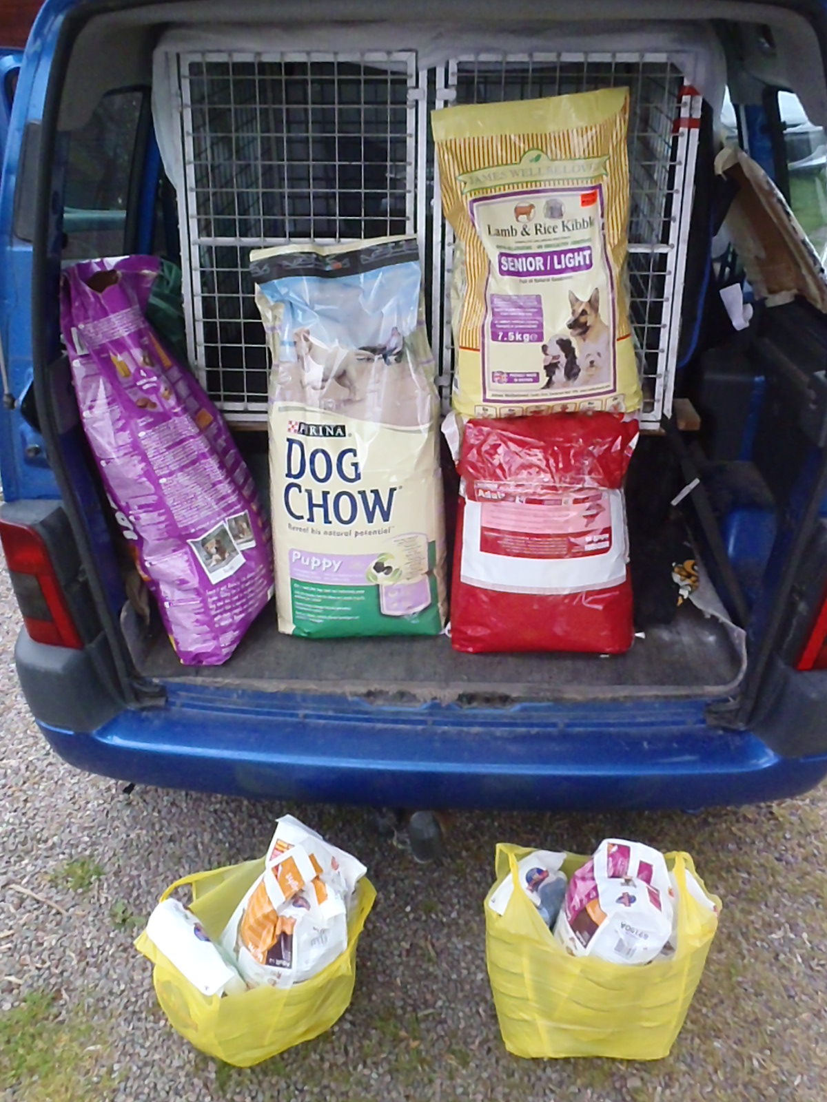 När Axa dog så blev jag stående med en öppnad säck foder som jag inte hade någon användning för eftersom Heinz bara äter RC Sensible (känslig mage). Det kändes tråkigt att kasta bort helt ok hundfoder, så säcken blev stående i förrådet ett tag. Tills jag såg en uppmaning på hundstallets hemsida om att skänka foder till dem (http://www.hundstallet.se/index.php/nyheter/bloggen/1091). Men då det kändes lite trist att bara åka med en säck ner till Stockholm så åkte jag förbi några hundaffärer i Uppsala och frågade om inte de kunde skänka några säckar de också? Stort tack till Brukshundcenter och Fyrislund Petcenter som ställde upp och skänkte hundmatspåsar. Synd att inte alla affärer hakade på, men jag är glad för det jag fick!